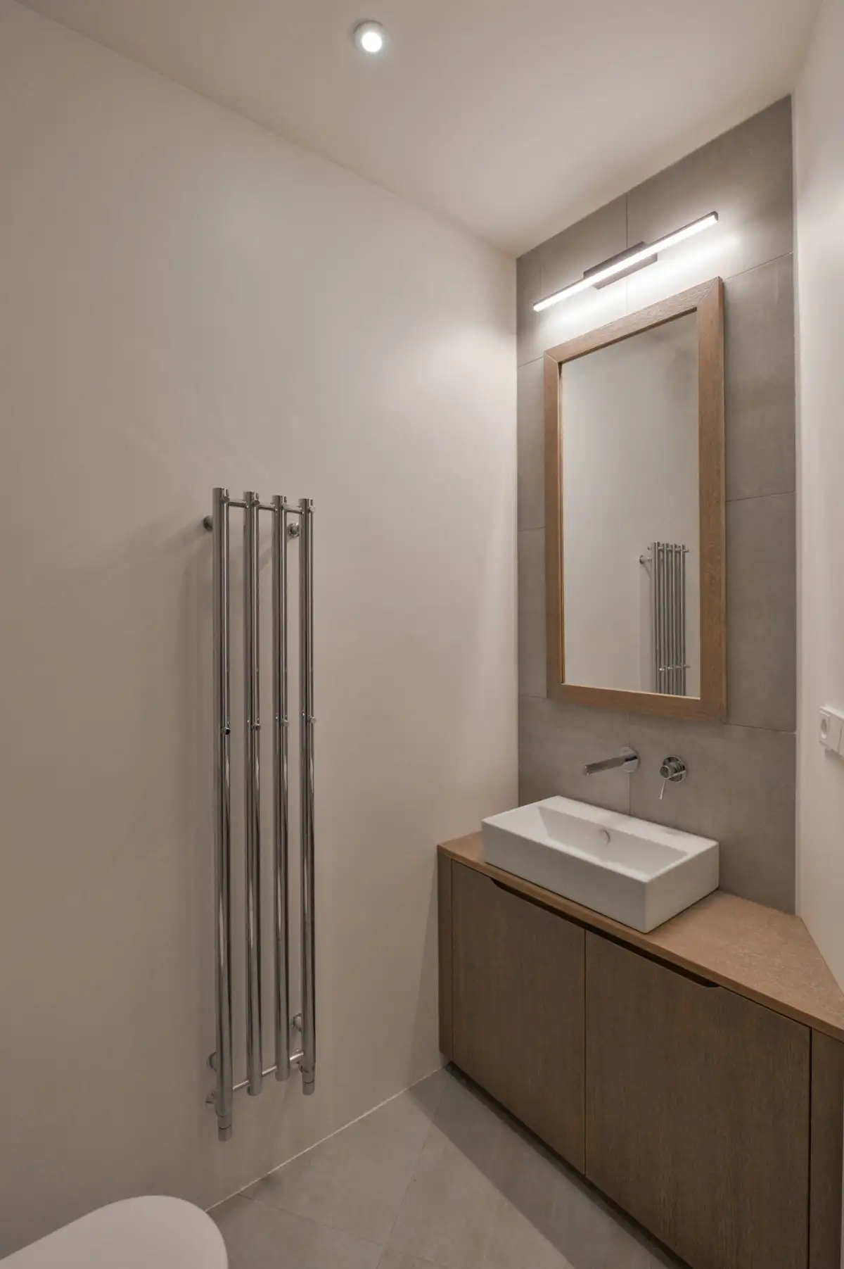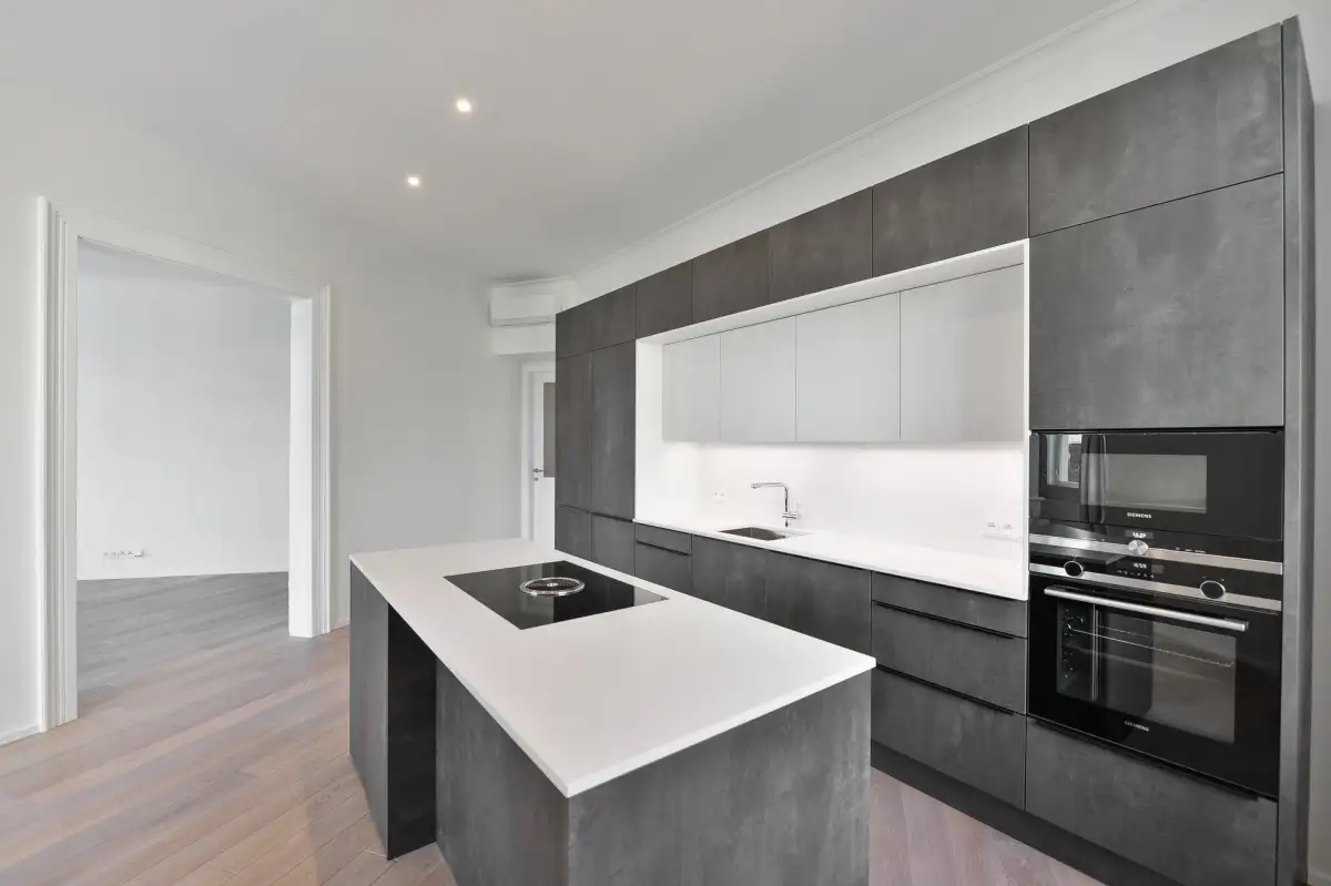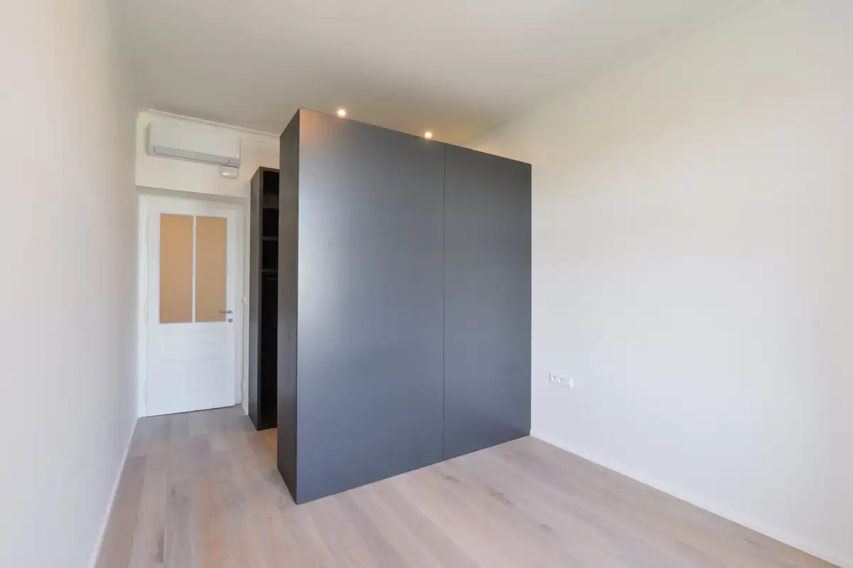 Dispozice nabízí vstupní chodbu, koupelnu se sprchovým koutem, toaletou a bidetem, master ložnici s en suite koupelnou se sprchovým koutem a toaletou, další ložnici a prostorný obývací pokoj s kuchyňským koutem vybaveným všemi spotřebiči – indukční varnou deskou, digestoří, horkovzdušnou troubou, myčkou a lednicí s mrazákem. Součástí vybavení je i pračka se sušičkou.