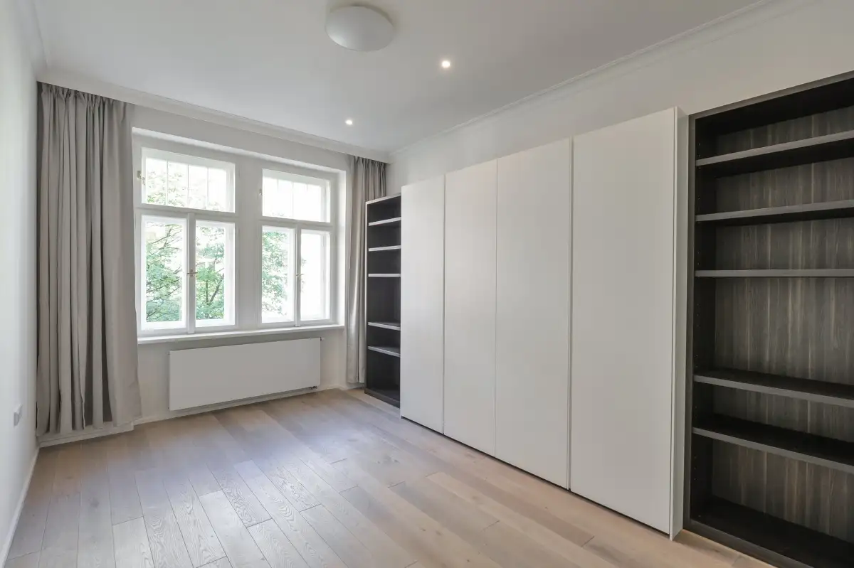 Rekonstrukce bytu proběhla ve vysokém standardu a byly zde použity nejkvalitnější materiály. Repasované dřevěné parkety, nová okna s dvouvrstvým sklem. Klimatizace ve všech místnostech.