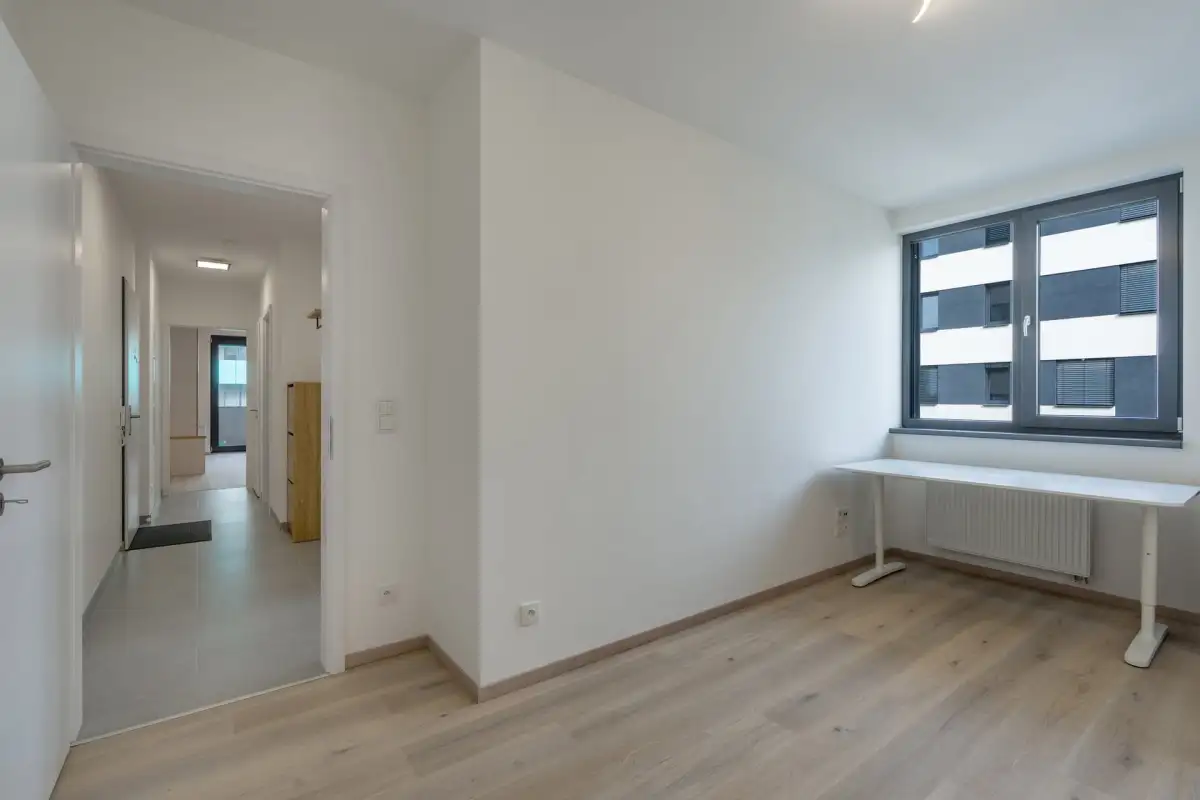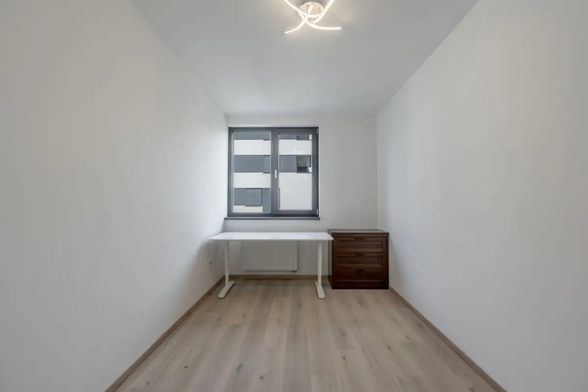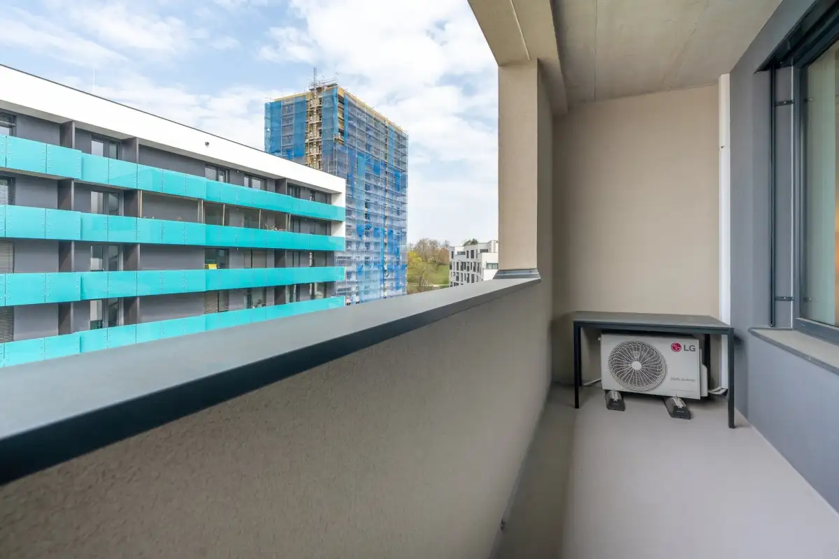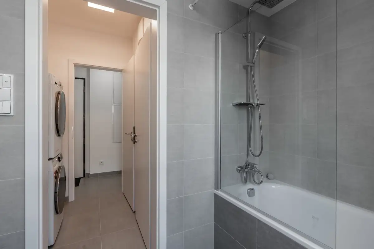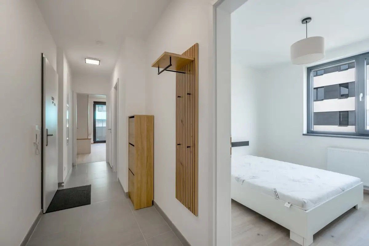 Dispozice zahrnují prostornou obývací místnost s moderním kuchyňským koutem na míru, ložnici, pracovnu či dětský pokoj, vstupní chodbu, koupelnu s vanou, oddělenou toaletu a technickou místnost s pračkou a sušičkou značky LG.