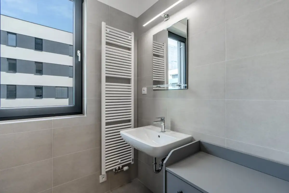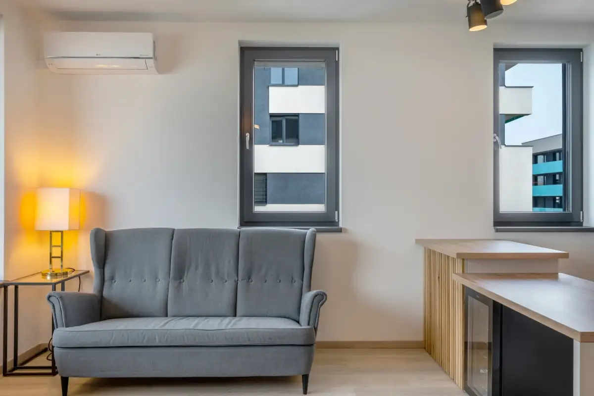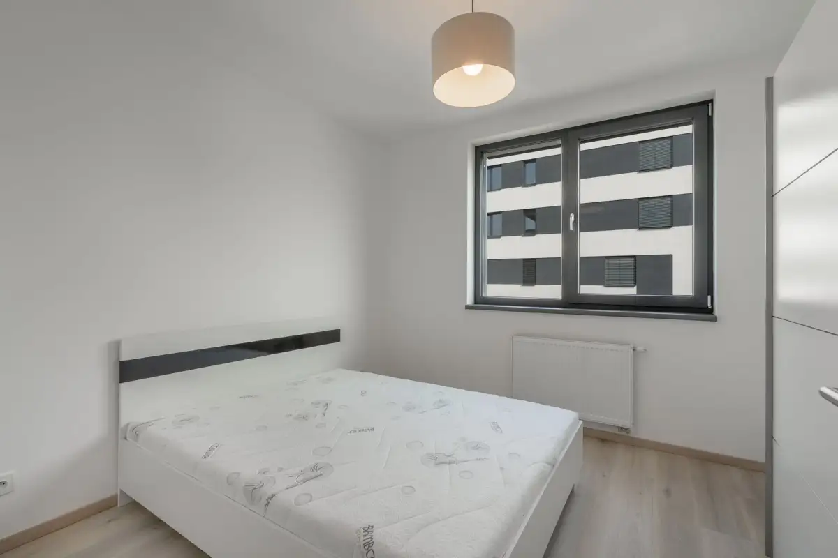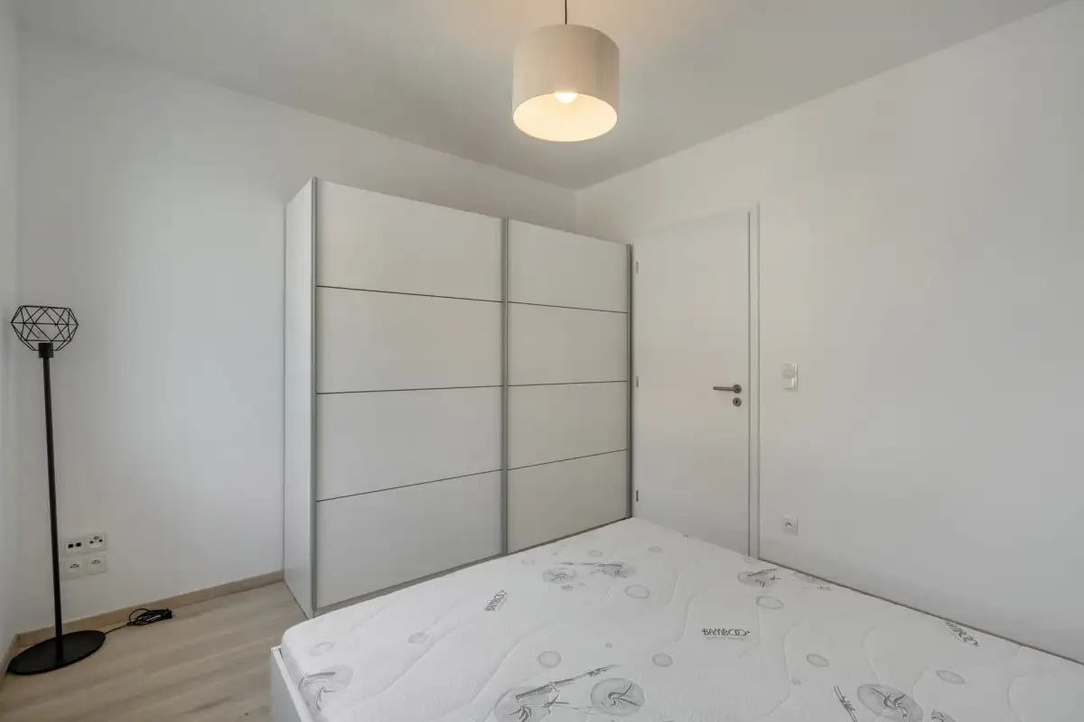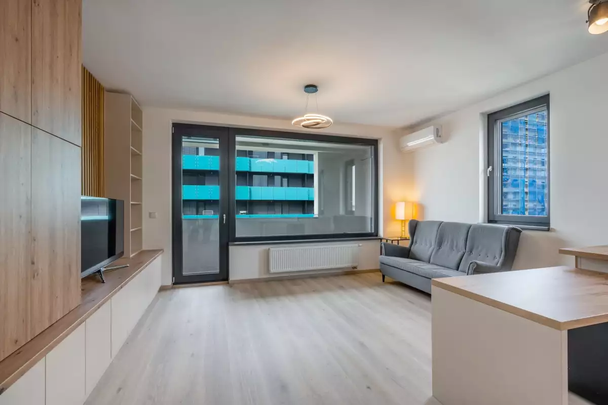 Dispozice zahrnují prostornou obývací místnost s moderním kuchyňským koutem na míru, ložnici, pracovnu či dětský pokoj, vstupní chodbu, koupelnu s vanou, oddělenou toaletu a technickou místnost s pračkou a sušičkou značky LG.