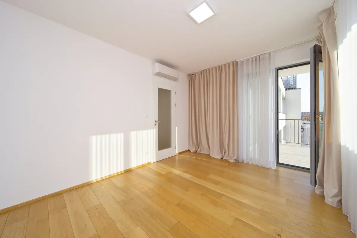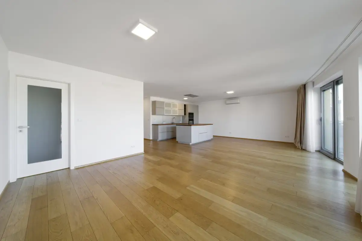 Samotný byt má podlahovou plochu 168 m² a skládá se z hlavní obývací místnosti (kuchyňského koutu, jídelní zóny a obývací zóny), na které navazuje balkon orientovaný na západní stranu do parku. Kuchyňská linka je plně vybavená (indukční deska, digestoř, myčka, trouby mikrovlnná a klasická, lednice, mrazák). Hlavní ložnice má též vstup na balkon se západní orientací, vlastní koupelnu včetně toalety a šatny s úložným prostorem. V bytě jsou dále dva pokoje, ze kterých je možné vstoupit na další balkon orientovaný na východní stranu. U pokojů je přilehlá koupelna s toaletou, v bytě je ještě technická místnost/ prádelna včetně samostatné toalety. Jednotlivé místnosti spojuje příjemná prostorná chodba, která plynule probíhá celým bytem. Součástí bytu je několik vestavěných skříní, které poskytují dostatečný prostor pro ukládání věcí. Všechny obytné místnosti disponují parketami, klimatizací a množstvím úložného prostoru.