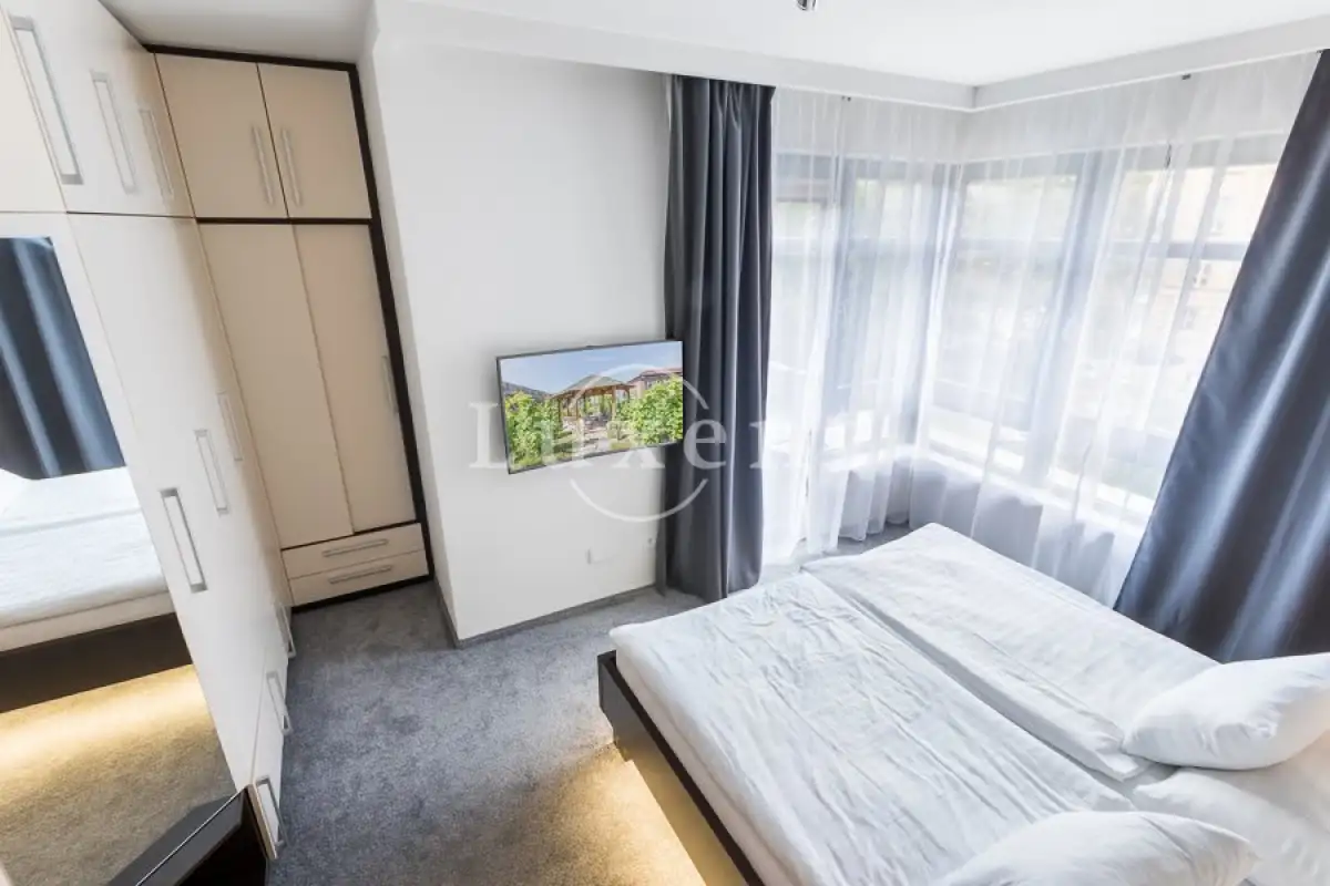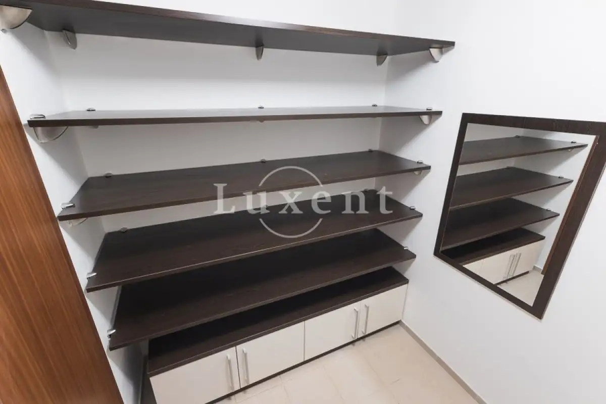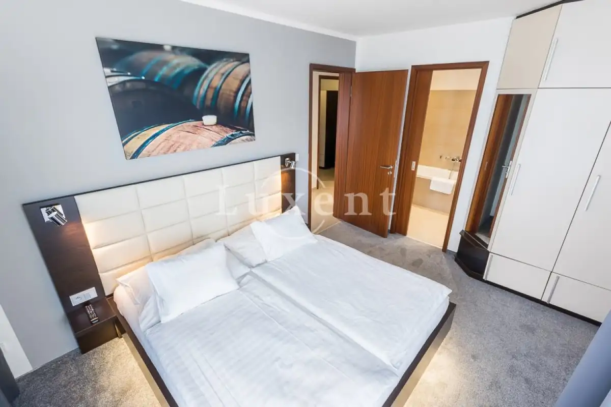 Byt disponuje dvěma ložnicemi, pracovnou a prostorným obývacím pokojem s kuchyňským koutem. Dále jsou zde dvě koupelny se sprchou a vanou a samostatná šatna. Byt je plně vybaven všemi spotřebiči, nádobím a spoustou úložného prostoru. V koupelně je sprchový kout, pračka a sušička. Podlahové topení v koupelně přispívá k pocitu dokonalého pohodlí.