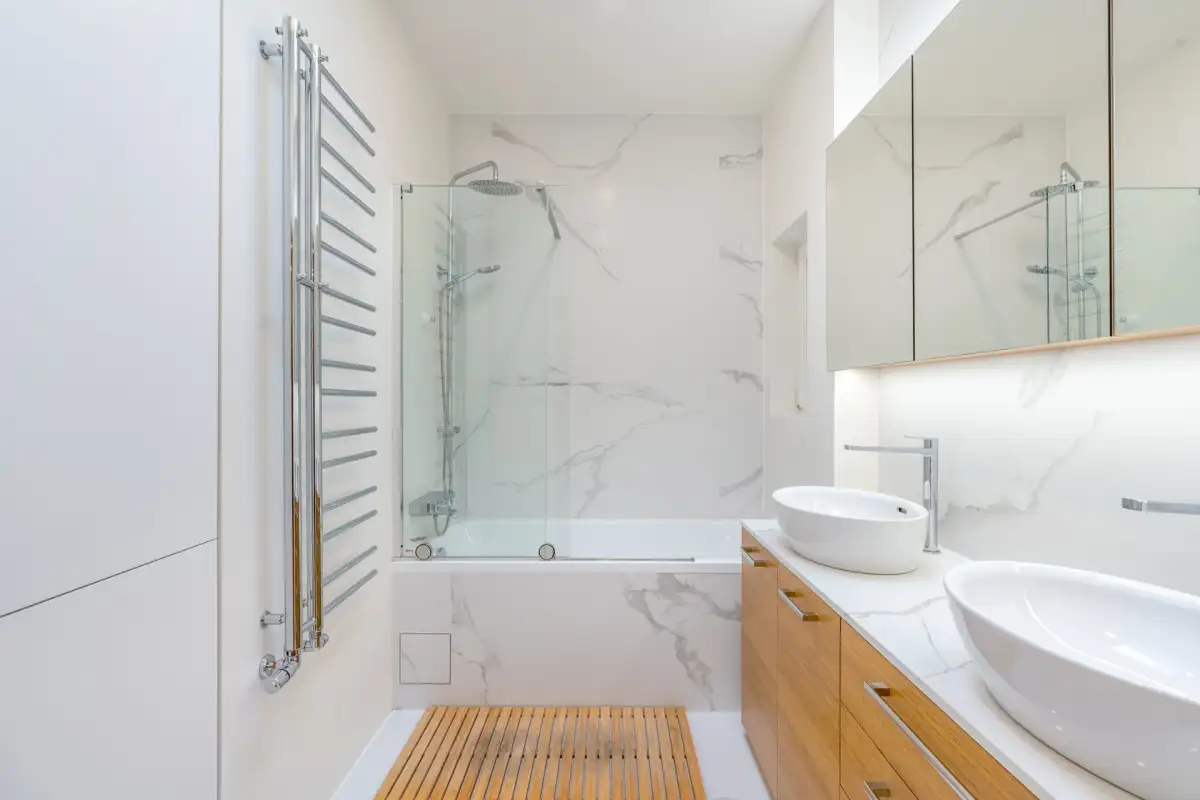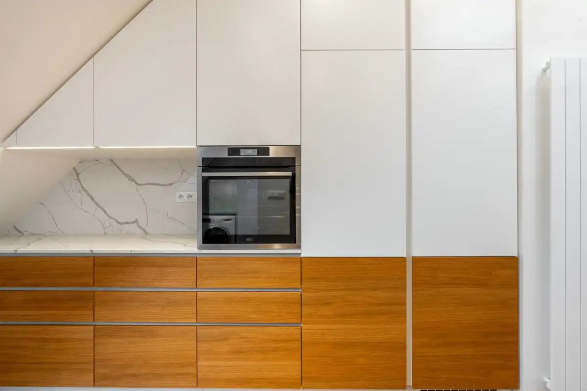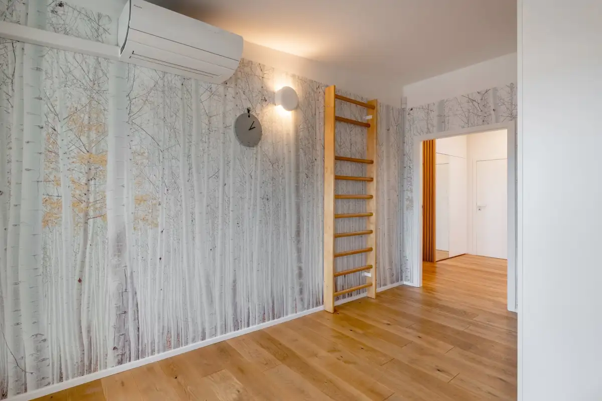 Dominantou bytu je světlý obývací pokoj s plně vybavenou kuchyní (všechny spotřebiče včetně myčky, indukční varné desky, trouby, lednice a mrazáku). Součástí dispozice je hlavní ložnice s vlastní walk-in šatnou, dále dětský pokoj a samostatná pracovna. Koupelna je vybavena dvojumyvadlem a vanou, toaleta je oddělená a navíc osazená bidetem.