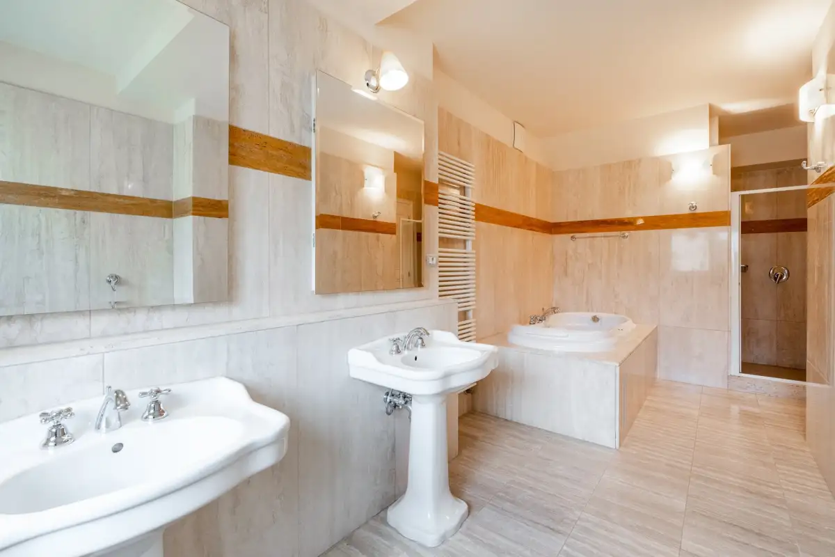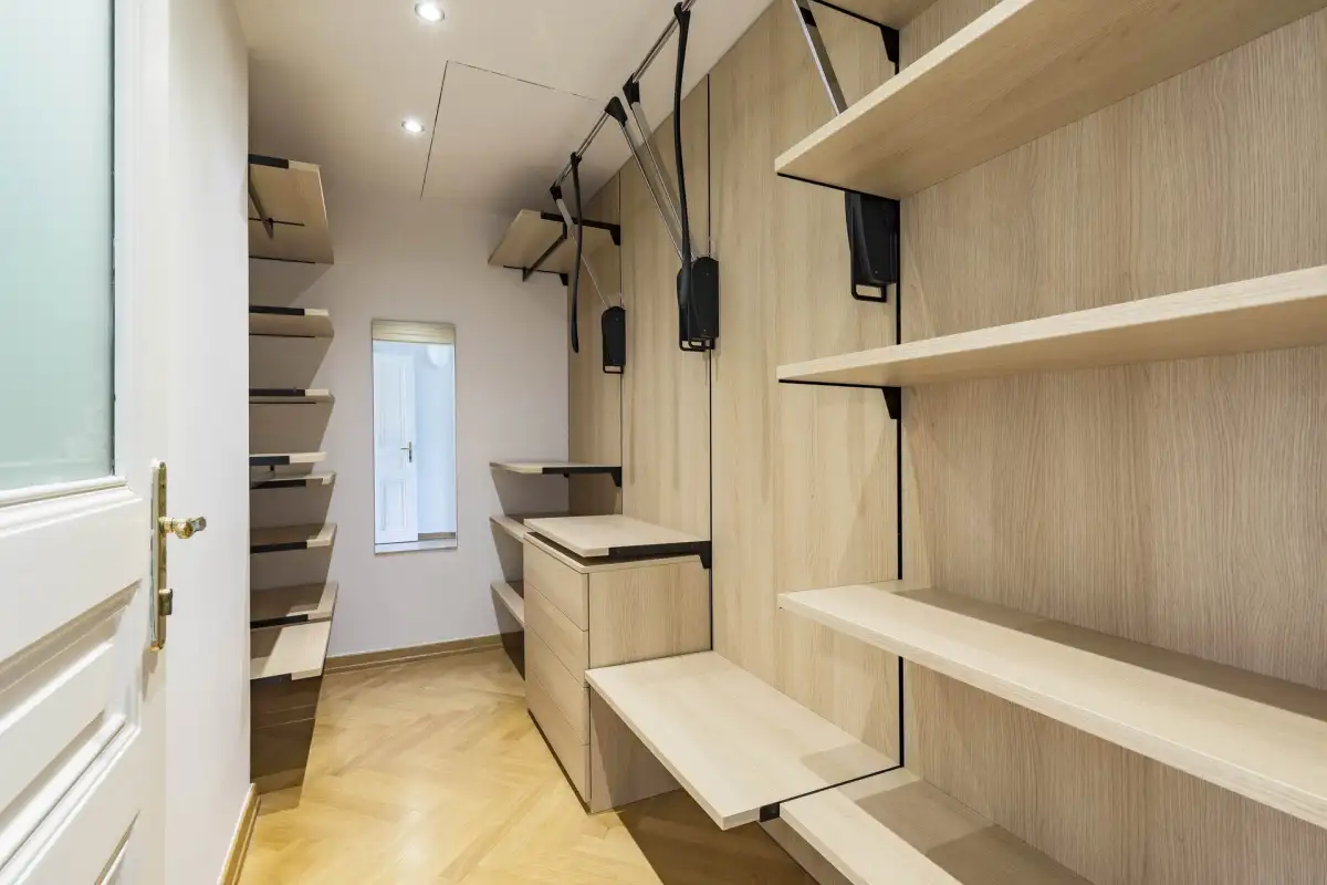 Dispozice bytu zahrnují v přízemí obývací místnost, kuchyň kompletně vybavenou všemi spotřebiči, tři ložnice, z nichž jedna disponuje vlastní šatnou a koupelnou s vanou, bidetem a toaletou, dále koupelnu s toaletou, bidetem a vanou a oddělenou komoru.