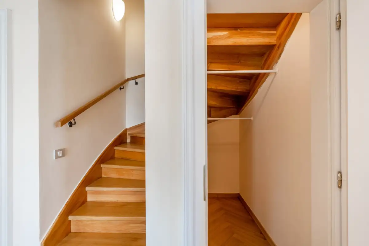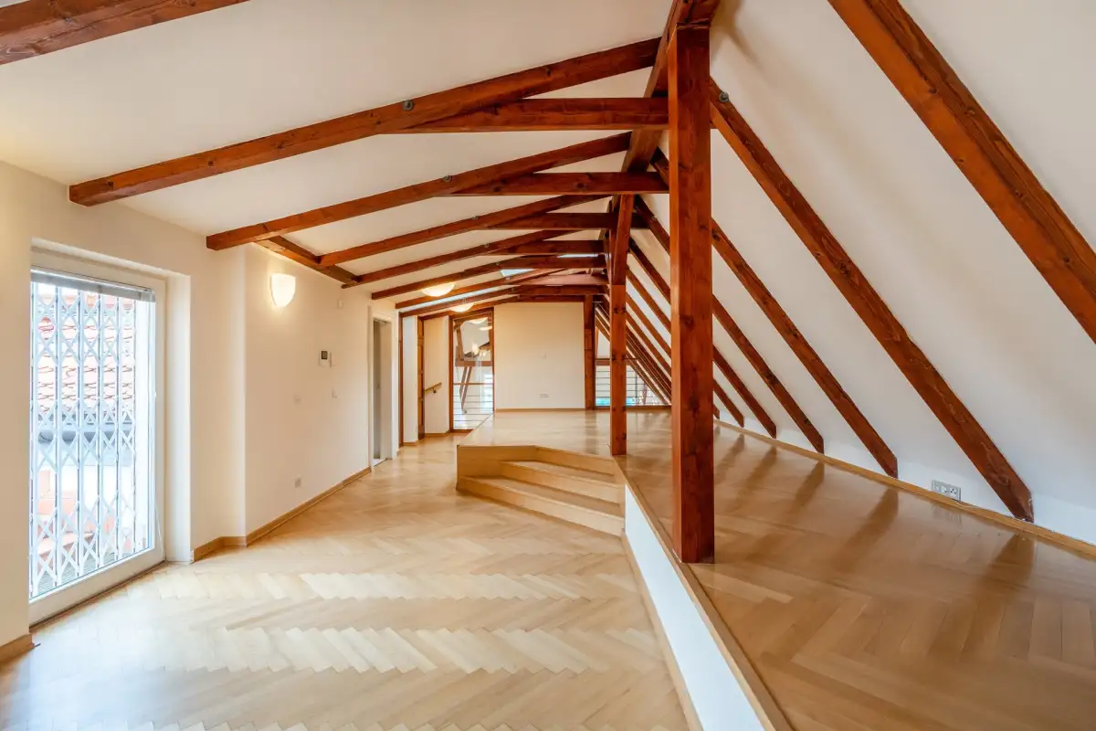 V prvním patře mezonetu se rozprostírá galerie s místností, kterou lze využít jako pracovnu či hernu pro děti, samostatná toaleta a vstup na prostorovou terasu s výhledem na Pražský hrad. Součástí je také komora s pračkou a sušičkou.