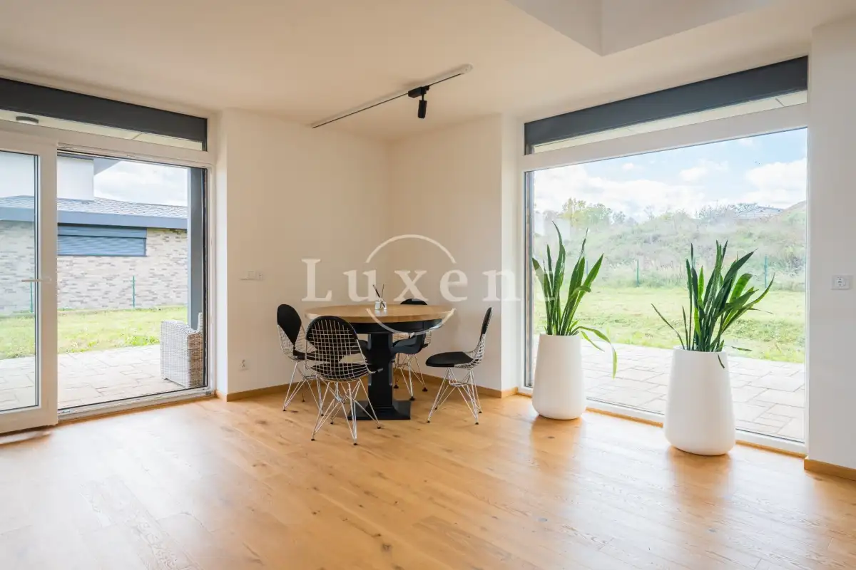 Dům je navržen v energeticky úsporném standardu a je vytápěn plynovým kotlem. Moderní a vzdušný interiér, vyhřívaná dřevěná dubová podlaha, úložné prostory v chodbě a elektricky ovladatelné předokenní rolety v celém domě. V obývacím pokoji je přípojka na komín pro případ umístění krbu. K domu náleží vlastní studna o hloubce 25 m s napojením do domu, dále nádrž na dešťovou vodu o velikosti 10 m³. Pozemek je mírně svažitý s jihovýchodní až jihozápadní orientací, nabízí malebný výhled do okolní krajiny lemované vzrostlou vegetací stromů.