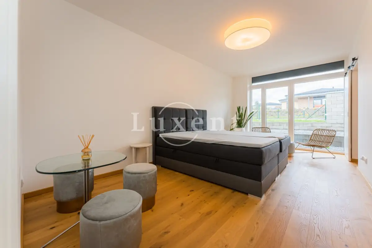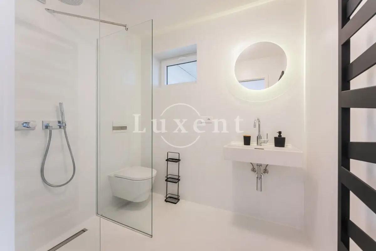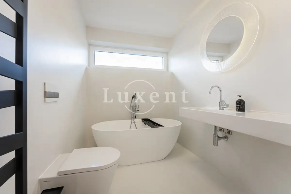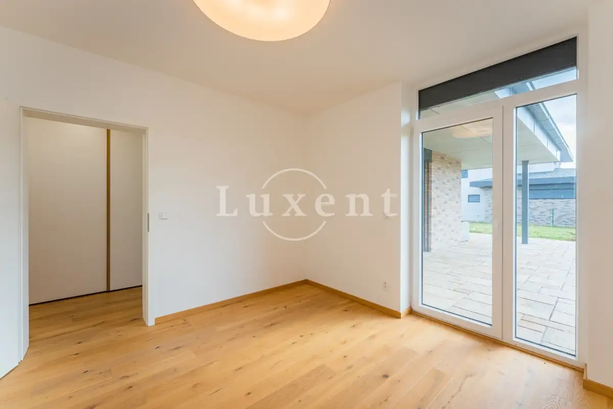 V domě jsou dále tři ložnice, z nichž dvě mají samostatný vstup na zahradu. Třetí ložnice má vlastní prostornou šatnu a samostatnou koupelnu se sprchovým koutem a toaletou. Chodba s prostornými vestavěnými skříněmi a luxusní designová koupelna Kartell s vanou, umyvadlem a toaletou.