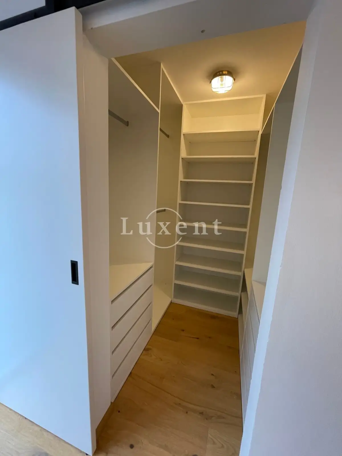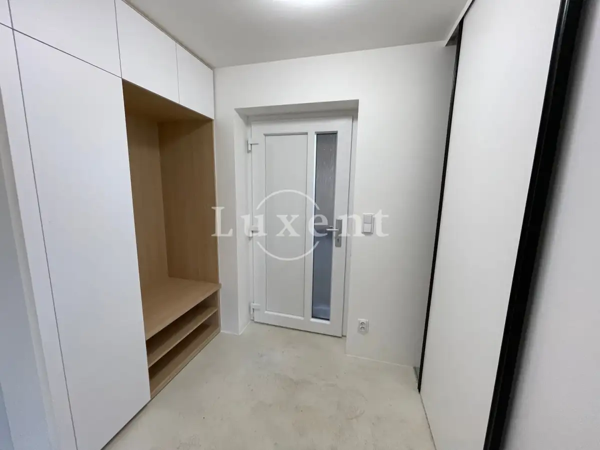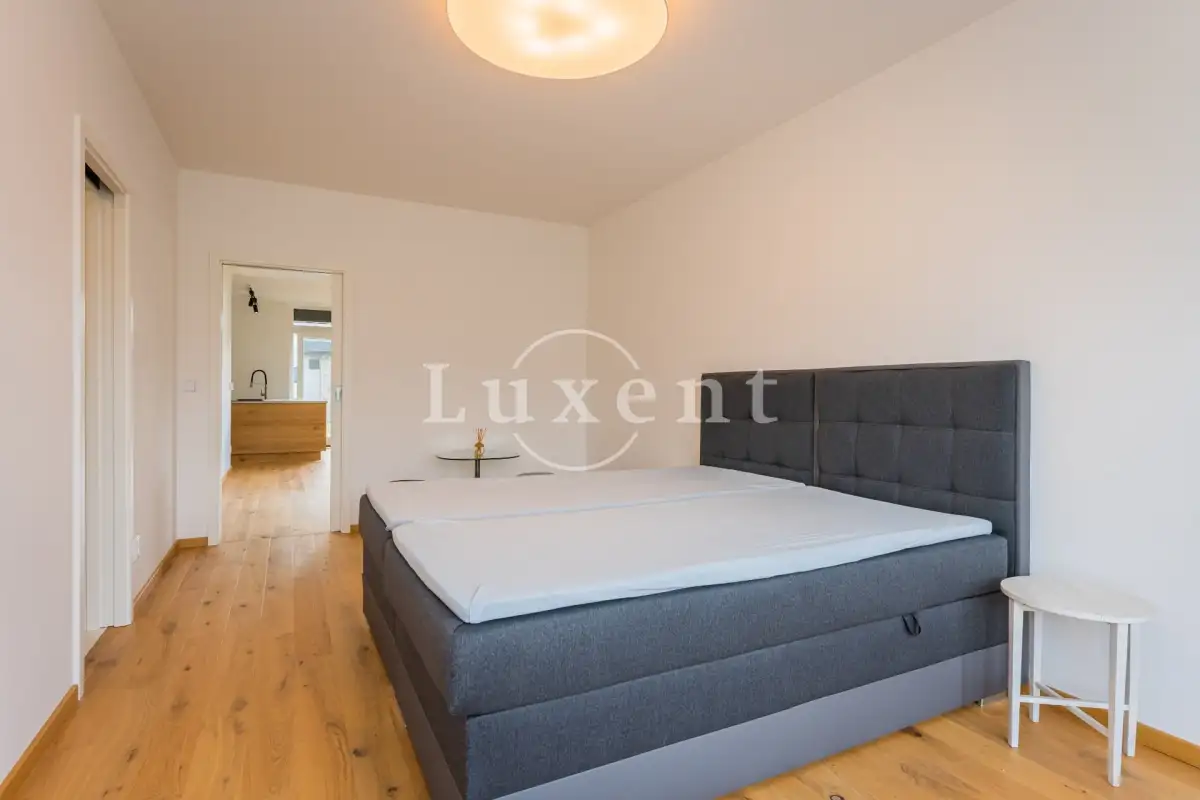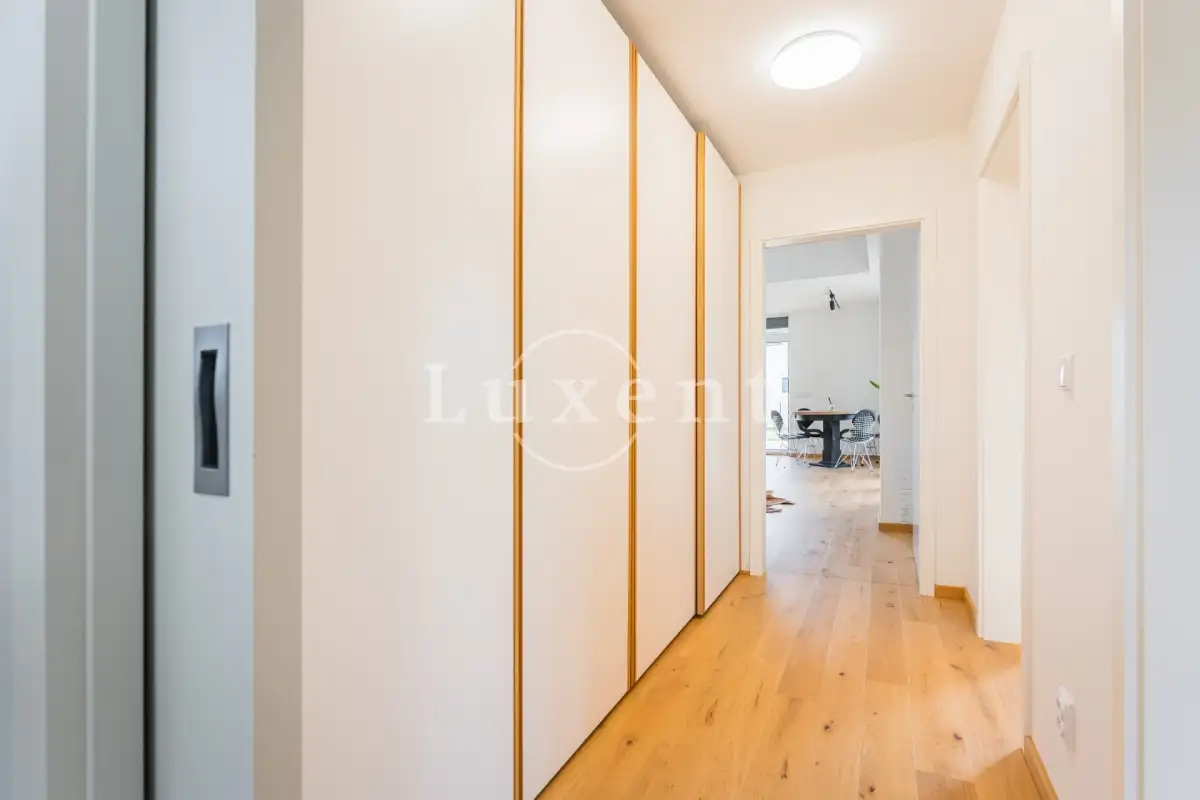 V domě jsou dále tři ložnice, z nichž dvě mají samostatný vstup na zahradu. Třetí ložnice má vlastní prostornou šatnu a samostatnou koupelnu se sprchovým koutem a toaletou. Chodba s prostornými vestavěnými skříněmi a luxusní designová koupelna Kartell s vanou, umyvadlem a toaletou.