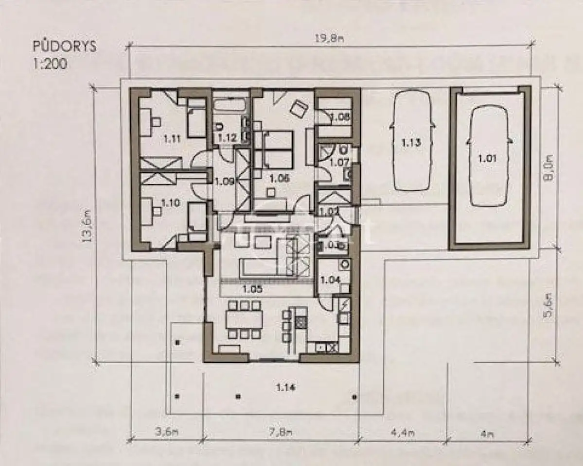 Dispozice domu zahrnují vstupní chodbu s vestavěnou skříní, vzdušný, slunný a prostorný obývací pokoj s jídelním a luxusním kuchyňským koutem vyrobeným na míru s mramorovou deskou, kuchyně plně vybavena vestavěnými spotřebiči – lednice s mrazákem, trouba, mikrovlnná trouba a myčka, varná deska s digestoří. V kuchyni je vstup do technické místnosti s plynovým kotlem, kterou lze využít také jako spíž. Dům je vybaven nábytkem na míru. Obývací pokoj disponuje velkými francouzskými okny a vstupem na zahradu s venkovním posezením.