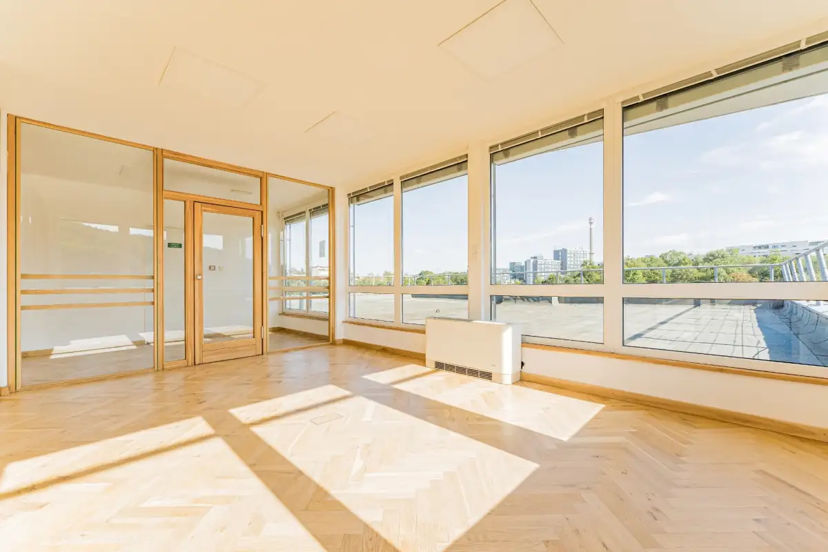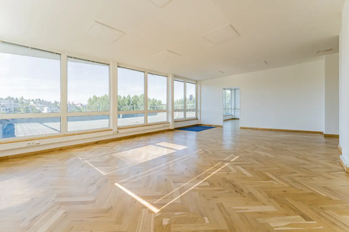 Kancelář se nachází v 5NP budovy s krásným výhledem do okolí, má terasu. Prostor skládá se z hlavního otevřeného prostoru 4 menších kanceláří oddělených skleněnými příčkami.