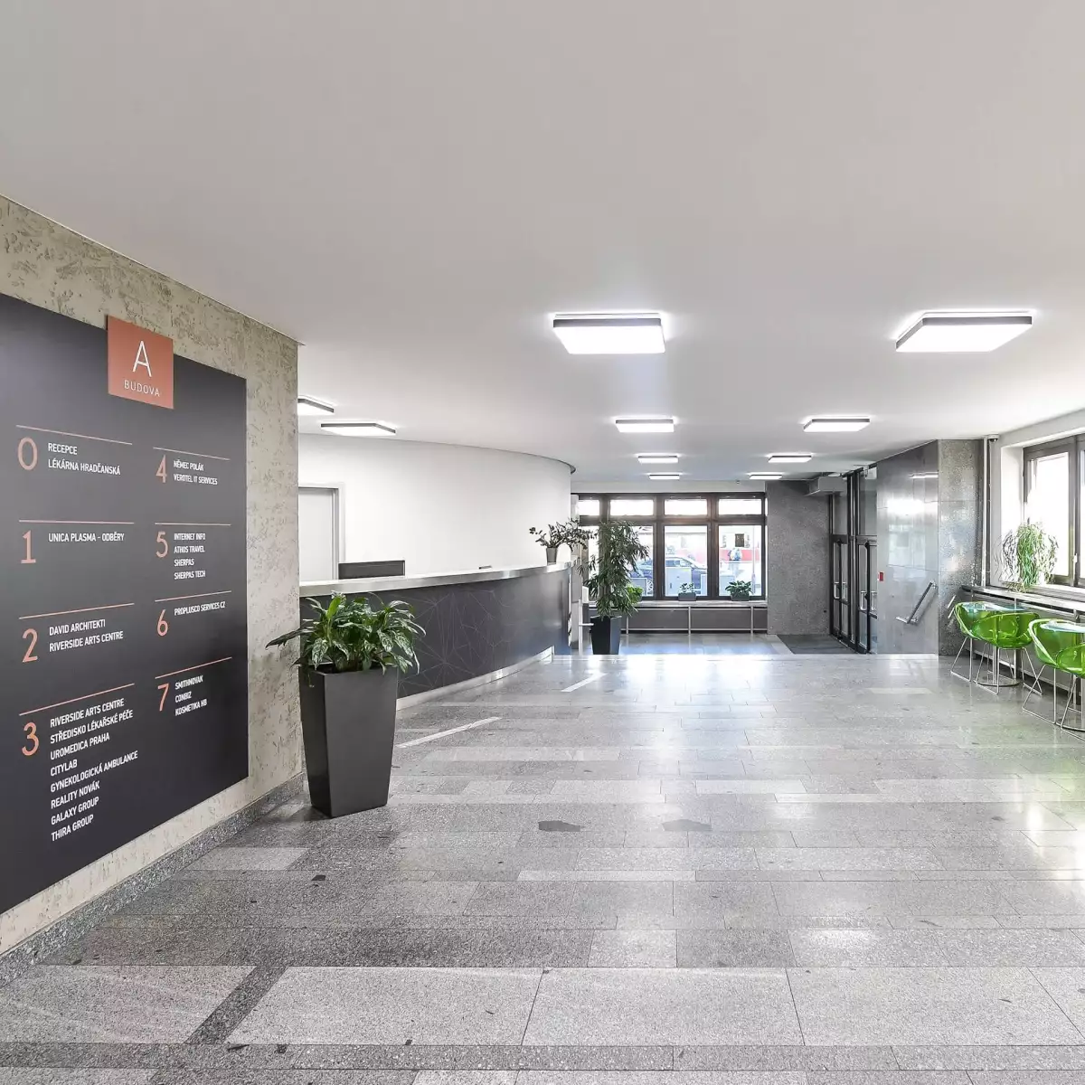 Z nejvyšších pater se můžete těšit na nádherný výhled na Pražský hrad a v docházkové vzdálenosti najdete park Letná. Celkem tato budova nabízí unikátní a příjemné pracovní prostředí, které ocení jak menší, tak i větší subjekty.